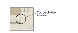 La coupe droite consiste à couper les extrémités des moulures perpendiculairement, à 90°, pour qu’elles rencontrent directement une autre pièce. Cette technique permet aux cadrages de portes et fenêtres, ainsi qu’aux plinthes, de « mourir » proprement dans les rosettes ou les socles. Elle offre une finition nette et simple, idéale pour un look classique et précis.