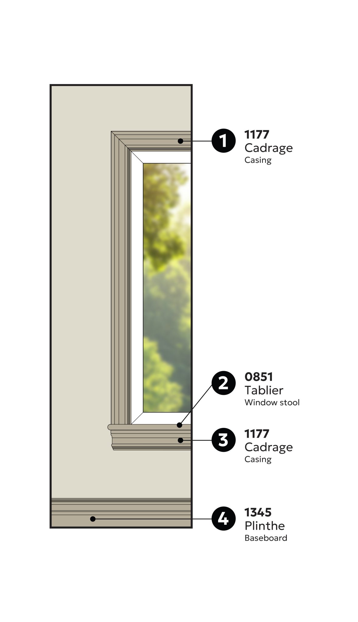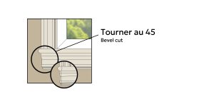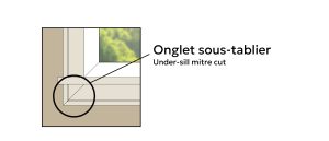 Contrairement à la coupe au 45 classique, cette technique consiste à tourner le tablier et le cadrage du bas de la fenêtre uniquement sur les extrémités. La moulure de face est coupée à 45° aux deux extrémités, tandis que les moulures pour tourner ne sont biseautées qu’à l’extrémité jointe à la moulure de face. Cette méthode crée une transition visuelle fluide entre le tablier et le cadrage, offrant un fini soigné et harmonieux.
